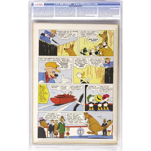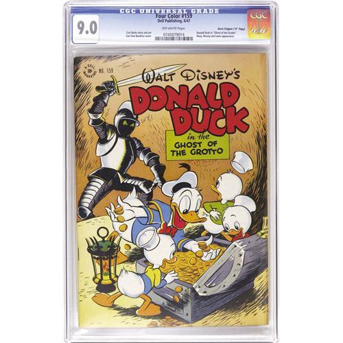 <B>Four Color #159 Donald Duck in "The Ghost of the Grotto" - Davis Crippen ("D" Copy) pedigree (Dell, 1947) CGC VF/NM 9.0 Off-white pages.</B></I> Carl Von Buettner contributed the duck action cover; master Carl Barks did the inside work. Huey, Dewey, and Louie make appearances, as well. Overstreet 2006 VF/NM 9.0 value = $1,069; NM- 9.2 value = $1,500. CGC census 7/06: 3 in 9.0, 2 higher. <I>From the Crippen Collection.</B></I> <BR><BR><B>Important notice:</B> Heritage usually auctions material at the rate of 200-250 lots per hour. On some occasions eBay Live bid software or the Internet may not be able to keep up with the pace of the auction. We recommend placing a realistic absentee bid now as insurance to avoid disappointment. Occasionally the auctioneer may eliminate or reject an eBay Live bid, and the auctioneer may also reopen a lot after the close of the eBay live bidding (usually because we missed an audience bid), and may reject your bid even if it shows you as the winning bidder. By bidding via eBay Live, you agree that Heritage may award the lot to another bidder at its sole discretion under the circumstances described above or any other reasonable circumstances. Since eBay bids are not shown to us until we open the lot on the floor, we treat those bids just like floor bids. In most cases the floor responds before the eBay bid is presented to us, due to Internet lag time, so for consistency we have made it a policy that floor bids are always considered first over tie eBay live bids. Also please note that all Heritage lots purchased through eBay Live carry a 22.5% Buyer's Premium. Please make sure you read the Terms and Conditions before you bid. This lot is being auctioned in conjunction with a live floor auction by Heritage Auction Galleries. All final auction and invoice information will be supplied by Heritage Auction Galleries, and all other information should be considered preliminary. Lot:41001 <BR><BR><B>Winning Notification and Billing:</B> After the FINAL session in this auction is complete, Heritage will send e-mail and snail mail invoices. This process normally takes several days. All final auction and invoice information will be supplied by Heritage Auction Galleries, and all other information should be considered preliminary. <BR><BR>This auction will be conducted on a live auction floor and over the Internet through eBay Live. If you choose to place an absentee bid, please take a moment to <font color='#0000ff'><u><a href='http://pages.ebay.com/liveauctions/help/before/laabsentee.html'>learn how eBay Live absentee bidding works</a></u></font><font color='#000000'>