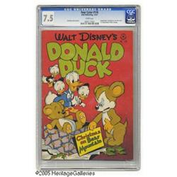 <B>Four Color #178 Donald Duck in "Christmas on Bear Mountain" (Dell, 1947) CGC VF- 7.5 White pages.</B></I> Uncle Scrooge McDuck made his very first appearance in this issue, and we mean his first appearance <I>anywhere</B></I>, as the character didn't debut in a cartoon but rather was created for the comics by Carl Barks. Actually, it's said that Scrooge was only intended to be a throwaway character for this one issue, but he soon took on a life of his own and became an indispensable part of the Duck mythos. Disney issues don't get much more significant than this one. Overstreet 2004 VF 8.0 value = $750. CGC census 12/04: 3 in 7.5, 11 higher.
