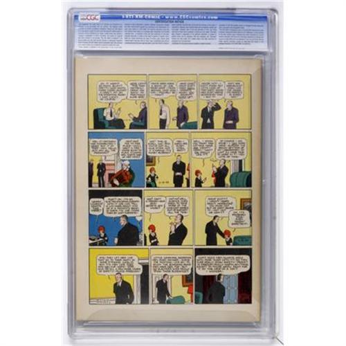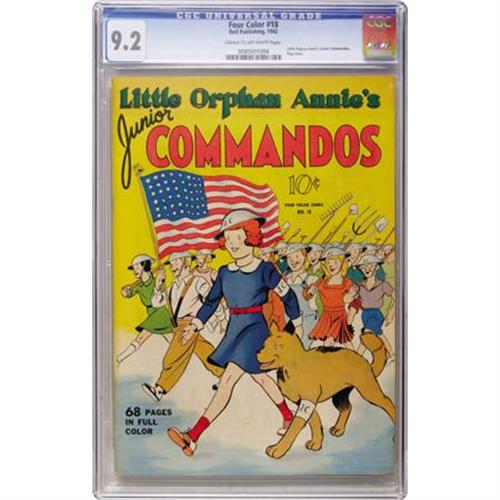 <B>Four Color #18 Little Orphan Annie's Junior Commandos (Dell, 1942) CGC NM- 9.2 Cream to off-white pages.</B></I> Who else should lead our nations children to victory in the war effort, wielding pitchforks, rakes, and shovels, but Little Orphan Annie? This issue's American flag cover wraps strips reprinted from June to November of 1942. Overstreet 2007 NM- 9.2 value = $650. CGC census 6/07: 1 in 9.2, none higher.<BR><BR><b>Shipping:</b> Comics - Slabbed (certified) (<a target="_blank" href="http://www.heritageauctions.com/common/shipping.php">view shipping information</a>)