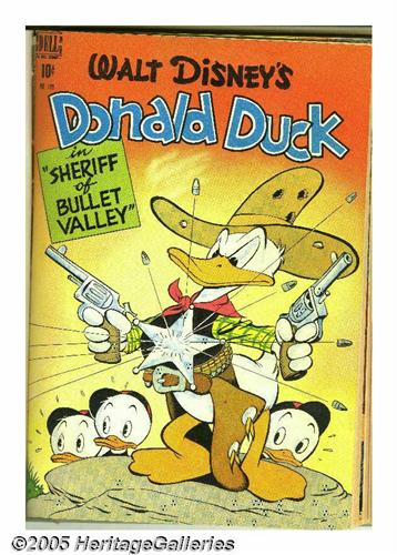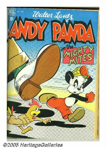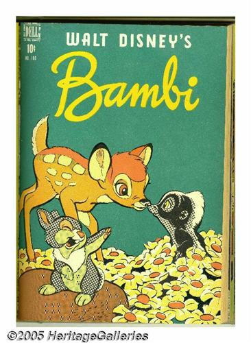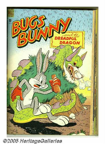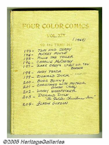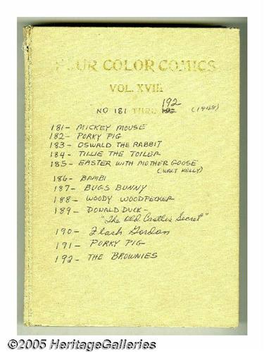 <B>Four Color #181-204 Bound Volumes (Dell, 1948).</B></I> These are Western Publishing file copies which have been trimmed and bound into two hardcover volumes. The most notable issues in this run are Donald Duck stories by Carl Barks in #189, 199, and 203, and three stories with Walt Kelly art, #185 (<I>Easter with Mother Goose</B></I>), 192 (<I>The Brownies</B></I>), and 201 (<I>Christmas with Mother Goose</B></I>). The bindings of both books are starting to come loose at the hinges. Approximate Overstreet VG 4.0 value for group = $950. <I>From the Random House Archives.</B></I>