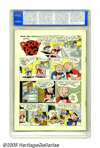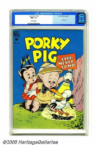 <B>Four Color #182 Porky Pig (Dell, 1948) CGC NM+ 9.6 Off-white pages.</B></I> It's "Porky Pig in Ever-Never Land," with the lovely Petunia by his side! Overstreet 2005 NM- 9.2 value = $175. CGC census 3/05: 1 in 9.6, none higher.