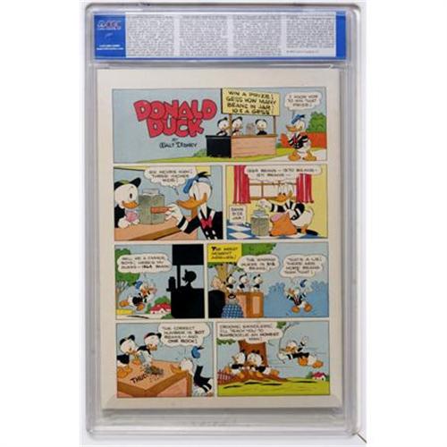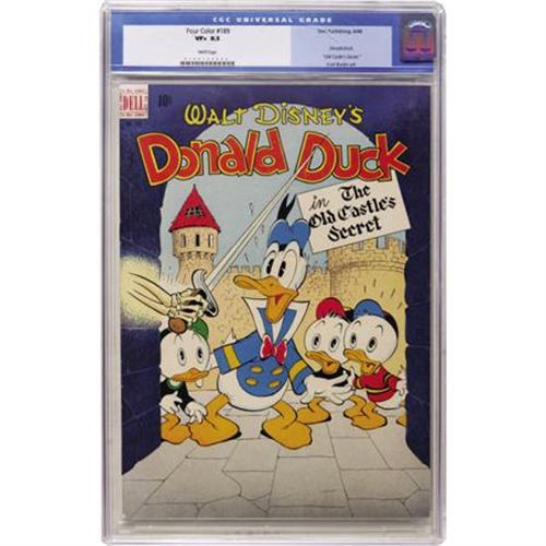 <B>Four Color #189 Donald Duck (Dell, 1948) CGC VF+ 8.5 White pages.</B></I> This is the only copy we've offered that's received the "white pages" designation from CGC, as well as being the nicest copy we've seen, period. Carl Barks provided the story and art for the yarn "The Old Castle's Secret." Overstreet 2007 VF 8.0 value = $570; VF/NM 9.0 value = $985. CGC census 6/07: 2 in 8.5, none higher.<BR><BR><b>Shipping:</b> Comics - Slabbed (certified) (<a target="_blank" href="http://www.heritageauctions.com/common/shipping.php">view shipping information</a>)
