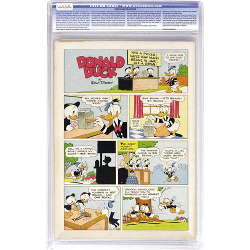<B>Four Color #189 Donald Duck in "The Old Castle's Secret" - Davis Crippen ("D" Copy) pedigree (Dell, 1948) CGC VF- 7.5 Cream to off-white pages.</B></I> Uncle Scrooge made only his second appearance in this issue! According to some accounts, Scrooge was meant to be a one-shot character when first introduced in <B>Four Color</B></I> #178, but some six months later, Carl Barks brought him back for this story, in which he played a much bigger role than in his previous outing. The rest is history! The title tells you all you need to know about the rollicking Barks yarn that has made this a highly collectible issue. Overstreet 2006 VF 8.0 value = $536. CGC census 6/06: 3 in 7.5, 4 higher. <I>From the Crippen Collection.</B></I> <BR><BR><B>Important notice:</B> Heritage usually auctions material at the rate of 200-250 lots per hour. On some occasions eBay Live bid software or the Internet may not be able to keep up with the pace of the auction. We recommend placing a realistic absentee bid now as insurance to avoid disappointment. Occasionally the auctioneer may eliminate or reject an eBay Live bid, and the auctioneer may also reopen a lot after the close of the eBay live bidding (usually because we missed an audience bid), and may reject your bid even if it shows you as the winning bidder. By bidding via eBay Live, you agree that Heritage may award the lot to another bidder at its sole discretion under the circumstances described above or any other reasonable circumstances. Since eBay bids are not shown to us until we open the lot on the floor, we treat those bids just like floor bids. In most cases the floor responds before the eBay bid is presented to us, due to Internet lag time, so for consistency we have made it a policy that floor bids are always considered first over tie eBay live bids. Also please note that all Heritage lots purchased through eBay Live carry a 22.5% Buyer's Premium. Please make sure you read the Terms and Conditions before you bid. This lot is being auctioned in conjunction with a live floor auction by Heritage Auction Galleries. All final auction and invoice information will be supplied by Heritage Auction Galleries, and all other information should be considered preliminary. Lot:41001 <BR><BR><B>Winning Notification and Billing:</B> After the FINAL session in this auction is complete, Heritage will send e-mail and snail mail invoices. This process normally takes several days. All final auction and invoice information will be supplied by Heritage Auction Galleries, and all other information should be considered preliminary. <BR><BR>This auction will be conducted on a live auction floor and over the Internet through eBay Live. If you choose to place an absentee bid, please take a moment to <font color='#0000ff'><u><a href='http://pages.ebay.com/liveauctions/help/before/laabsentee.html'>learn how eBay Live absentee bidding works</a></u></font><font color='#000000'>