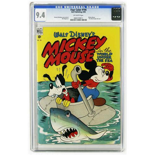 <B>Four Color #194 Mickey Mouse in the World Under the Sea (Dell, 1948) CGC NM 9.4 Off-white pages.</B></I> Mickey and Goofy take to the sea -- by submarine -- in this fun adventure featuring art by Harvey Eisenberg and Bill Wright. "When the shark bites...." This sharp copy is fresh and glossy, and currently tops the CGC census list. Overstreet 2005 NM- 9.2 value = $280. CGC census 12/05: 1 in 9.4, none higher.