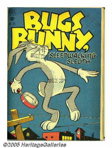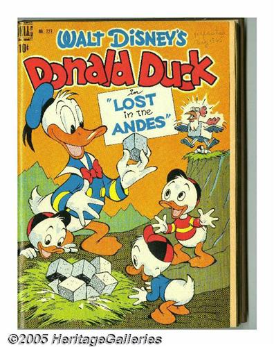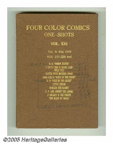 <B>Four Color #217-261 Bound Volumes (Dell, 1949).</B></I> The year 1949 yielded a number of classic issues of Dell's <B>Four Color</B></I> series, many which been collected in these four bound volumes. The books are from the Western Publishing offices, where file copies of each comic book published were gathered, bound, and trimmed into these hardcover collections for office use (several stories have hand-written notes in the borders listing its reprint history). Issues include #217 through 261; highlights include: <B>Donald Duck</B></I> in "Lost in the Andes," "Voodoo Hoodoo," and "Luck of the North" by Carl Barks; <B>Easter with Mother Goose</B></I>, <B>The Brownies</B></I>, <B>Christmas With Mother Goose</B></I> and <B>Santa Claus Funnies</B></I> featuring art by Walt Kelly; plus issues of <B>Flash Gordon</B></I>, <B>Adventure Bound</B></I>, <B>Bugs Bunny</B></I>, <B>Mickey Mouse</B></I>, and more. Many comics appear like-new, while some have minor damage or "Office Copy" stamped on the covers, and the bindings for the first two volumes have come loose; still, these extremely scarce items are sure to generate heavy interest. Get your bid in now! Approximate Overstreet VG 4.0 value for group = $1,150. <I>From the Random House Archives.</B></I>