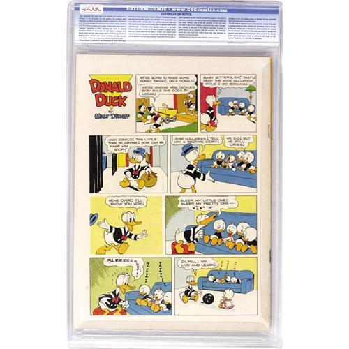 <B>Four Color #223 Donald Duck in "Lost in the Andes" - Davis Crippen ("D" Copy) pedigree (Dell, 1949) CGC VF 8.0 Off-white to white pages.</B></I> Carl Barks created his famous square eggs story for this issue, as well as the noteworthy cover and interior art. Overstreet 2006 VF 8.0 value = $553. CGC census 7/06: 2 in 8.0, 3 higher. <I>From the Crippen Collection.</B></I> <BR><BR><B>Important notice:</B> Heritage usually auctions material at the rate of 200-250 lots per hour. On some occasions eBay Live bid software or the Internet may not be able to keep up with the pace of the auction. We recommend placing a realistic absentee bid now as insurance to avoid disappointment. Occasionally the auctioneer may eliminate or reject an eBay Live bid, and the auctioneer may also reopen a lot after the close of the eBay live bidding (usually because we missed an audience bid), and may reject your bid even if it shows you as the winning bidder. By bidding via eBay Live, you agree that Heritage may award the lot to another bidder at its sole discretion under the circumstances described above or any other reasonable circumstances. Since eBay bids are not shown to us until we open the lot on the floor, we treat those bids just like floor bids. In most cases the floor responds before the eBay bid is presented to us, due to Internet lag time, so for consistency we have made it a policy that floor bids are always considered first over tie eBay live bids. Also please note that all Heritage lots purchased through eBay Live carry a 22.5% Buyer's Premium. Please make sure you read the Terms and Conditions before you bid. This lot is being auctioned in conjunction with a live floor auction by Heritage Auction Galleries. All final auction and invoice information will be supplied by Heritage Auction Galleries, and all other information should be considered preliminary. Lot:41001 <BR><BR><B>Winning Notification and Billing:</B> After the FINAL session in this auction is complete, Heritage will send e-mail and snail mail invoices. This process normally takes several days. All final auction and invoice information will be supplied by Heritage Auction Galleries, and all other information should be considered preliminary. <BR><BR>This auction will be conducted on a live auction floor and over the Internet through eBay Live. If you choose to place an absentee bid, please take a moment to <font color='#0000ff'><u><a href='http://pages.ebay.com/liveauctions/help/before/laabsentee.html'>learn how eBay Live absentee bidding works</a></u></font><font color='#000000'>