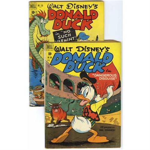 <B>Four Color #308 and 318 Donald Duck - File Copy Group (Dell, 1951) Condition: GD+.</B></I> Includes #308 (Donald Duck in "Dangerous Disguise") and #318 (Donald Duck in "No Such Varmint"). Carl Barks art in both issues. Approximate Overstreet value for group = $100. <BR><BR><b>Shipping:</b> Comics - Unslabbed (<a target="_blank" href="http://www.heritageauctions.com/common/shipping.php">view shipping information</a>)