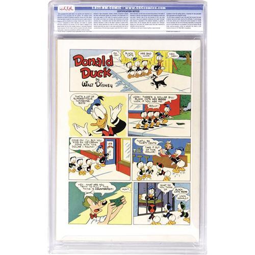 <B>Four Color #328 Donald Duck in "Old California" - Davis Crippen ("D" Copy) pedigree (Dell, 1951) CGC NM- 9.2 Off-white to white pages.</B></I> Believe it or not, the use of the hallucinogenic peyote is depicted in this issue -- not something one expects to find in a Disney book. Esteemed Duck writer-artist Carl Barks provided story and art. Overstreet 2006 NM- 9.2 value = $650. CGC census 7/06: 1 in 9.2, 2 higher. <I>From the Crippen Collection.</B></I> <BR><BR><B>Important notice:</B> Heritage usually auctions material at the rate of 200-250 lots per hour. On some occasions eBay Live bid software or the Internet may not be able to keep up with the pace of the auction. We recommend placing a realistic absentee bid now as insurance to avoid disappointment. Occasionally the auctioneer may eliminate or reject an eBay Live bid, and the auctioneer may also reopen a lot after the close of the eBay live bidding (usually because we missed an audience bid), and may reject your bid even if it shows you as the winning bidder. By bidding via eBay Live, you agree that Heritage may award the lot to another bidder at its sole discretion under the circumstances described above or any other reasonable circumstances. Since eBay bids are not shown to us until we open the lot on the floor, we treat those bids just like floor bids. In most cases the floor responds before the eBay bid is presented to us, due to Internet lag time, so for consistency we have made it a policy that floor bids are always considered first over tie eBay live bids. Also please note that all Heritage lots purchased through eBay Live carry a 22.5% Buyer's Premium. Please make sure you read the Terms and Conditions before you bid. This lot is being auctioned in conjunction with a live floor auction by Heritage Auction Galleries. All final auction and invoice information will be supplied by Heritage Auction Galleries, and all other information should be considered preliminary. Lot:41001 <BR><BR><B>Winning Notification and Billing:</B> After the FINAL session in this auction is complete, Heritage will send e-mail and snail mail invoices. This process normally takes several days. All final auction and invoice information will be supplied by Heritage Auction Galleries, and all other information should be considered preliminary. <BR><BR>This auction will be conducted on a live auction floor and over the Internet through eBay Live. If you choose to place an absentee bid, please take a moment to <font color='#0000ff'><u><a href='http://pages.ebay.com/liveauctions/help/before/laabsentee.html'>learn how eBay Live absentee bidding works</a></u></font><font color='#000000'>