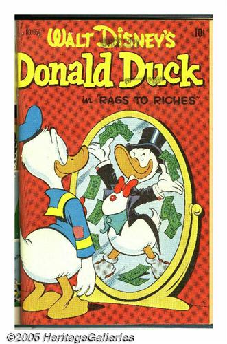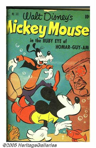 <B>Four Color #338-367 Bound Volumes (Dell, 1951).</B></I> Donald Duck in "A Christmas for Shacktown" by Carl Barks (#367) is the highlight of this group, which includes two other Donald Duck issues with Barks covers as well as issues starring Alice in Wonderland, Mickey Mouse, Porky Pig, Woody Woodpecker, and other characters too numerous to mention. The comics are file copies which have been trimmed and bound into three hardcover volumes. Almost all have an "office copy" stamp on the cover; most have a single number written in pencil on the first page of the comic. Overstreet 2005 VG 4.0 value for group = $888. <I>From the Random House Archives.</B></I>