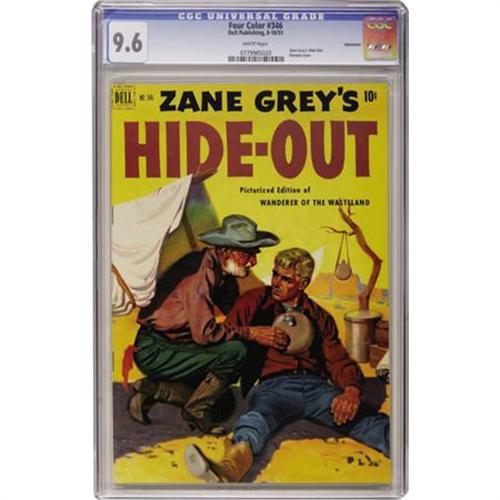 <B>Four Color #346 Zane Grey's Hide-Out - Vancouver pedigree (Dell, 1951) CGC NM+ 9.6 White pages.</B></I> Painted cover. Overstreet 2007 NM- 9.2 value = $70. CGC census 6/07: 1 in 9.6, none higher.<BR><BR><b>Shipping:</b> Comics - Slabbed (certified) (<a target="_blank" href="http://www.heritageauctions.com/common/shipping.php">view shipping information</a>)
