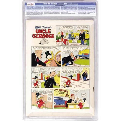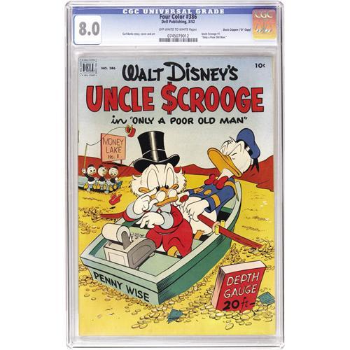 <B>Four Color #386 Uncle Scrooge in "Only a Poor Old Man" - Davis Crippen ("D" Copy) pedigree (Dell, 1952) CGC VF 8.0 Off-white to white pages.</B></I> Uncle Scrooge was developed not in a Walt Disney cartoon, but rather in the Donald Duck stories written and drawn by Carl Barks. And this was Scrooge's very first solo story! Both the cover and the interior art are by Barks. This counts as <B>Uncle Scrooge</B></I> #1, as he would appear in two more <B>Four Color</B></I> issues before his own title began with #4. This story has deservedly been reprinted many a time, but of course there's no bigger thrill than owning the original. Overstreet 2006 VF 8.0 value = $850. CGC census 7/06: 3 in 8.0, 15 higher. <I>From the Crippen Collection.</B></I> <BR><BR><B>Important notice:</B> Heritage usually auctions material at the rate of 200-250 lots per hour. On some occasions eBay Live bid software or the Internet may not be able to keep up with the pace of the auction. We recommend placing a realistic absentee bid now as insurance to avoid disappointment. Occasionally the auctioneer may eliminate or reject an eBay Live bid, and the auctioneer may also reopen a lot after the close of the eBay live bidding (usually because we missed an audience bid), and may reject your bid even if it shows you as the winning bidder. By bidding via eBay Live, you agree that Heritage may award the lot to another bidder at its sole discretion under the circumstances described above or any other reasonable circumstances. Since eBay bids are not shown to us until we open the lot on the floor, we treat those bids just like floor bids. In most cases the floor responds before the eBay bid is presented to us, due to Internet lag time, so for consistency we have made it a policy that floor bids are always considered first over tie eBay live bids. Also please note that all Heritage lots purchased through eBay Live carry a 22.5% Buyer's Premium. Please make sure you read the Terms and Conditions before you bid. This lot is being auctioned in conjunction with a live floor auction by Heritage Auction Galleries. All final auction and invoice information will be supplied by Heritage Auction Galleries, and all other information should be considered preliminary. Lot:41001 <BR><BR><B>Winning Notification and Billing:</B> After the FINAL session in this auction is complete, Heritage will send e-mail and snail mail invoices. This process normally takes several days. All final auction and invoice information will be supplied by Heritage Auction Galleries, and all other information should be considered preliminary. <BR><BR>This auction will be conducted on a live auction floor and over the Internet through eBay Live. If you choose to place an absentee bid, please take a moment to <font color='#0000ff'><u><a href='http://pages.ebay.com/liveauctions/help/before/laabsentee.html'>learn how eBay Live absentee bidding works</a></u></font><font color='#000000'>