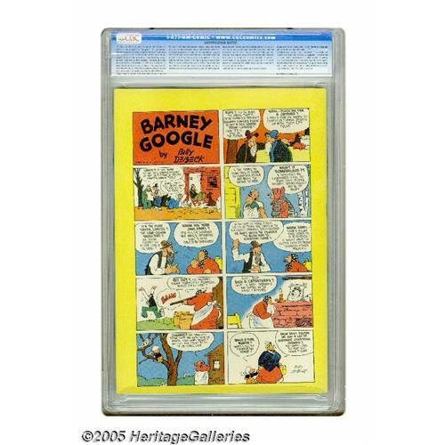 <B>Four Color #40 Barney Google and Snuffy Smith - File Copy (Dell, 1944) CGC NM- 9.2 Cream to off-white pages.</B></I> This issue reprints Sunday pages by Billy DeBeck which appeared from 1939-42 (DeBeck was deceased by the time this comic hit the stands). Our offering is the highest-graded copy of the issue that CGC has certified to date. Overstreet 2005 NM- 9.2 value = $350. CGC census 7/05: 1 in 9.2, none higher. <I>From the Random House Archives.</B></I> <BR><BR><B>Important notice:</B> Heritage usually auctions material at the rate of 200-250 lots per hour. On some occasions eBay Live bid software or the Internet may not be able to keep up with the pace of the auction. We recommend placing a realistic absentee bid now as insurance to avoid disappointment. Occasionally the auctioneer may eliminate or reject an eBay Live bid, and the auctioneer may also reopen a lot after the close of the eBay live bidding (usually because we missed an audience bid), and may reject your bid even if it shows you as the winning bidder. By bidding via eBay Live, you agree that Heritage may award the lot to another bidder at its sole discretion under the circumstances described above or any other reasonable circumstances. Since eBay bids are not shown to us until we open the lot on the floor, we treat those bids just like floor bids. In most cases the floor responds before the eBay bid is presented to us, due to Internet lag time, so for consistency we have made it a policy that floor bids are always considered first over tie eBay live bids. Also please note that all Heritage lots purchased through eBay Live carry a 20% Buyer's Premium. Please make sure you read the Terms and Conditions before you bid. This lot is being auctioned in conjunction with a live floor auction by Heritage Galleries & Auctioneers. All final auction and invoice information will be supplied by Heritage Galleries & Auctioneers, and all other information should be considered preliminary. Lot:3175 <BR><BR><B>Win