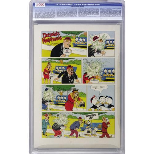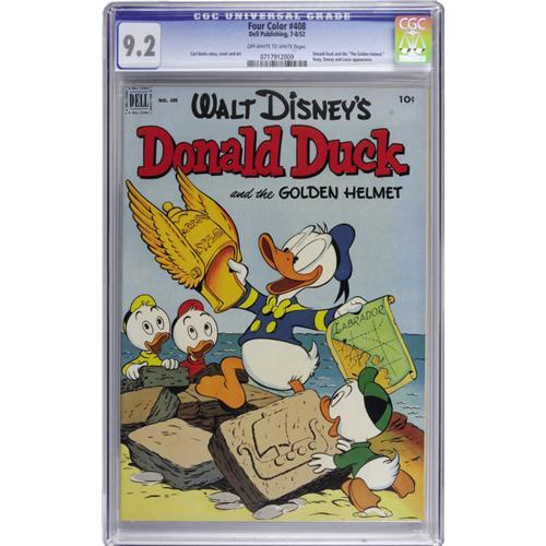 <B>Four Color #408 Donald Duck and the Golden Helmet (Dell, 1952) CGC NM- 9.2 Off-white to white pages.</B></I> Writer/artist Carl Barks delivered another classic here, as museum guard Donald discovers the ship's log of an old Viking vessel, and before you know it he's racing to find a golden helmet and save the USA! Overstreet 2006 NM- 9.2 value = $525. CGC census 10/06: 1 in 9.2, 1 higher.<BR><BR><b>Shipping:</b> Slabbed Comic (<a target="_blank" href="http://www.heritageauctions.com/common/shipping.php">view shipping information</a>)