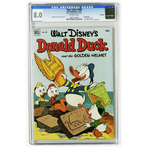 <B>Four Color #408 Donald Duck and the Golden Helmet - File Copy (Dell, 1952) CGC VF 8.0 Off-white pages.</B></I> Carl Barks story, cover, and art. Overstreet 2006 VF 8.0 value = $233. CGC census 3/06: 4 in 8.0, 7 higher. <I>From the Random House Archives.</B></I>