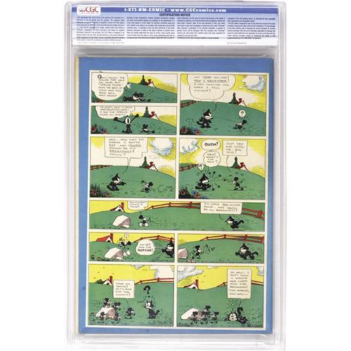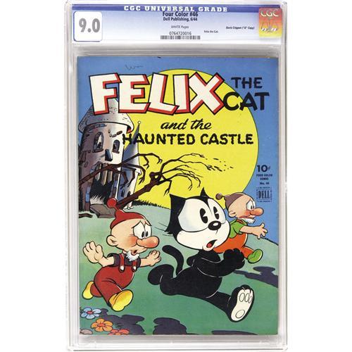 <B>Four Color #46 Felix the Cat - Davis Crippen ("D" Copy) pedigree (Dell, 1944) CGC VF/NM 9.0 White pages.</B></I> Those intrepid souls who seek to put together a <B>Four Color</B></I> run have an even tougher chore if high grades are the goal. This is the sole highest-graded copy (as of this writing) of Felix's second <B>Four Color</B></I> appearance. Overstreet 2006 VF/NM 9.0 value = $477; NM- 9.2 value = $660. CGC census 6/06: 1 in 9.0, none higher. <I>From the Crippen Collection.</B></I> <BR><BR><B>Important notice:</B> Heritage usually auctions material at the rate of 200-250 lots per hour. On some occasions eBay Live bid software or the Internet may not be able to keep up with the pace of the auction. We recommend placing a realistic absentee bid now as insurance to avoid disappointment. Occasionally the auctioneer may eliminate or reject an eBay Live bid, and the auctioneer may also reopen a lot after the close of the eBay live bidding (usually because we missed an audience bid), and may reject your bid even if it shows you as the winning bidder. By bidding via eBay Live, you agree that Heritage may award the lot to another bidder at its sole discretion under the circumstances described above or any other reasonable circumstances. Since eBay bids are not shown to us until we open the lot on the floor, we treat those bids just like floor bids. In most cases the floor responds before the eBay bid is presented to us, due to Internet lag time, so for consistency we have made it a policy that floor bids are always considered first over tie eBay live bids. Also please note that all Heritage lots purchased through eBay Live carry a 22.5% Buyer's Premium. Please make sure you read the Terms and Conditions before you bid. This lot is being auctioned in conjunction with a live floor auction by Heritage Auction Galleries. All final auction and invoice information will be supplied by Heritage Auction Galleries, and all other information should be considered preliminary. Lot:41001 <BR><BR><B>Winning Notification and Billing:</B> After the FINAL session in this auction is complete, Heritage will send e-mail and snail mail invoices. This process normally takes several days. All final auction and invoice information will be supplied by Heritage Auction Galleries, and all other information should be considered preliminary. <BR><BR>This auction will be conducted on a live auction floor and over the Internet through eBay Live. If you choose to place an absentee bid, please take a moment to <font color='#0000ff'><u><a href='http://pages.ebay.com/liveauctions/help/before/laabsentee.html'>learn how eBay Live absentee bidding works</a></u></font><font color='#000000'>