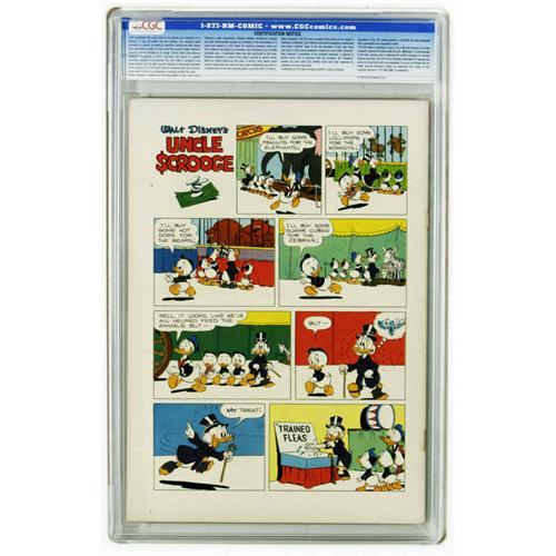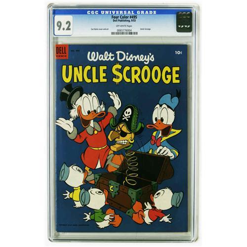 <B>Four Color #495 Uncle Scrooge (Dell, 1953) CGC NM- 9.2 Off-white pages.</B></I> The "Horseradish Treasure" story is featured in this third and final <B>Four Color</B></I> issue (regular numbering begins with the next issue, #4), with story and art by Carl Barks. This is the issue that introduced Scrooge's lucky Number One Dime. This is a wonderful, glossy copy. Overstreet 2005 NM- 9.2 value = $725. CGC census 12/05: 1 in 9.2, 1 higher.