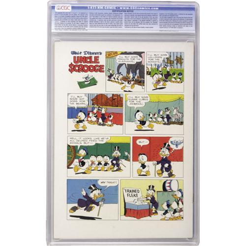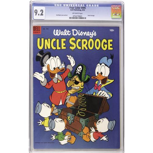 <B>Four Color #495 Uncle Scrooge (Dell, 1953) CGC NM- 9.2 Off-white pages.</B></I> Here's the last of three Scrooge <B>Four Color</B></I>s by Carl Barks. Mr. McDuck's own series would begin with #4. This copy's pristine back cover really wowed us, and as you can see, it looks superb from the front as well. Overstreet 2006 NM- 9.2 value = $800. CGC census 11/06: 2 in 9.2, 1 higher.<BR><BR><b>Shipping:</b> Slabbed Comic (<a target="_blank" href="http://www.heritageauctions.com/common/shipping.php">view shipping information</a>)