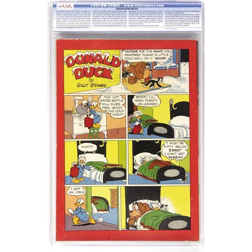 <B>Four Color #62 Donald Duck in "Frozen Cold" - Davis Crippen ("D" Copy) pedigree (Dell, 1945) CGC VF 8.0 Cream to off-white pages.</B></I> A classic by the duck master himself, Carl Barks. One of the most collected issues of the massive <B>Four Color</B></I> run, this one is a beauty with only slight corner wear and some light tanning around the edges. A must for any serious Disney collector. Overstreet 2006 VF 8.0 value = $1,461. CGC census 7/06: 3 in 8.0, 5 higher. <I>From the Crippen Collection.</B></I> <BR><BR><B>Important notice:</B> Heritage usually auctions material at the rate of 200-250 lots per hour. On some occasions eBay Live bid software or the Internet may not be able to keep up with the pace of the auction. We recommend placing a realistic absentee bid now as insurance to avoid disappointment. Occasionally the auctioneer may eliminate or reject an eBay Live bid, and the auctioneer may also reopen a lot after the close of the eBay live bidding (usually because we missed an audience bid), and may reject your bid even if it shows you as the winning bidder. By bidding via eBay Live, you agree that Heritage may award the lot to another bidder at its sole discretion under the circumstances described above or any other reasonable circumstances. Since eBay bids are not shown to us until we open the lot on the floor, we treat those bids just like floor bids. In most cases the floor responds before the eBay bid is presented to us, due to Internet lag time, so for consistency we have made it a policy that floor bids are always considered first over tie eBay live bids. Also please note that all Heritage lots purchased through eBay Live carry a 22.5% Buyer's Premium. Please make sure you read the Terms and Conditions before you bid. This lot is being auctioned in conjunction with a live floor auction by Heritage Auction Galleries. All final auction and invoice information will be supplied by Heritage Auction Galleries, and all other information should be considered preliminary. Lot:41001 <BR><BR><B>Winning Notification and Billing:</B> After the FINAL session in this auction is complete, Heritage will send e-mail and snail mail invoices. This process normally takes several days. All final auction and invoice information will be supplied by Heritage Auction Galleries, and all other information should be considered preliminary. <BR><BR>This auction will be conducted on a live auction floor and over the Internet through eBay Live. If you choose to place an absentee bid, please take a moment to <font color='#0000ff'><u><a href='http://pages.ebay.com/liveauctions/help/before/laabsentee.html'>learn how eBay Live absentee bidding works</a></u></font><font color='#000000'>