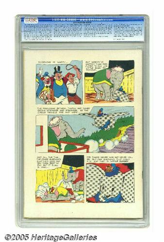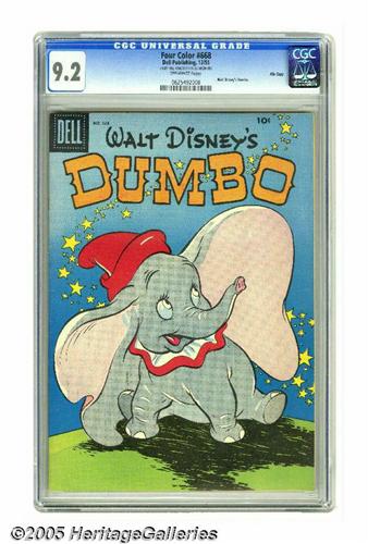 <B>Four Color #668 Walt Disney's Dumbo - File Copy (Dell, 1955) CGC NM- 9.2 Off-white pages.</B></I> The little elephant with the too-big ears never looked as cute as he does on the cover of this issue! This is the first "starry sky" printing, as noted in Overstreet's <B>Four Color</B></I> listing. Overstreet 2005 NM- 9.2 value = $150. CGC census, 3/05: 2 in 9.2, 1 higher. <I>From the Random House Archives.</B></I>