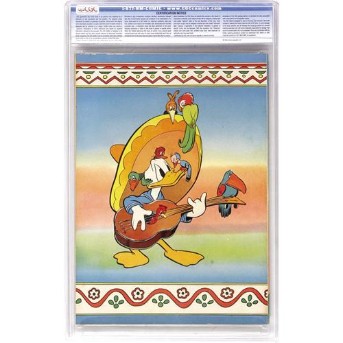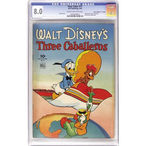 <B>Four Color #71 Three Caballeros - Davis Crippen ("D" Copy) pedigree (Dell, 1945) CGC VF 8.0 Cream to off-white pages.</B></I> Features art by Walt Kelly. This issue rates an "uncommon" on the Gerber scarcity index. Overstreet 2006 VF 8.0 value = $553. CGC census 7/06: 1 in 8.0, 4 higher. <I>From the Crippen Collection.</B></I> <BR><BR><B>Important notice:</B> Heritage usually auctions material at the rate of 200-250 lots per hour. On some occasions eBay Live bid software or the Internet may not be able to keep up with the pace of the auction. We recommend placing a realistic absentee bid now as insurance to avoid disappointment. Occasionally the auctioneer may eliminate or reject an eBay Live bid, and the auctioneer may also reopen a lot after the close of the eBay live bidding (usually because we missed an audience bid), and may reject your bid even if it shows you as the winning bidder. By bidding via eBay Live, you agree that Heritage may award the lot to another bidder at its sole discretion under the circumstances described above or any other reasonable circumstances. Since eBay bids are not shown to us until we open the lot on the floor, we treat those bids just like floor bids. In most cases the floor responds before the eBay bid is presented to us, due to Internet lag time, so for consistency we have made it a policy that floor bids are always considered first over tie eBay live bids. Also please note that all Heritage lots purchased through eBay Live carry a 22.5% Buyer's Premium. Please make sure you read the Terms and Conditions before you bid. This lot is being auctioned in conjunction with a live floor auction by Heritage Auction Galleries. All final auction and invoice information will be supplied by Heritage Auction Galleries, and all other information should be considered preliminary. Lot:41001 <BR><BR><B>Winning Notification and Billing:</B> After the FINAL session in this auction is complete, Heritage will send e-mail and snail mail invoices. This process normally takes several days. All final auction and invoice information will be supplied by Heritage Auction Galleries, and all other information should be considered preliminary. <BR><BR>This auction will be conducted on a live auction floor and over the Internet through eBay Live. If you choose to place an absentee bid, please take a moment to <font color='#0000ff'><u><a href='http://pages.ebay.com/liveauctions/help/before/laabsentee.html'>learn how eBay Live absentee bidding works</a></u></font><font color='#000000'>