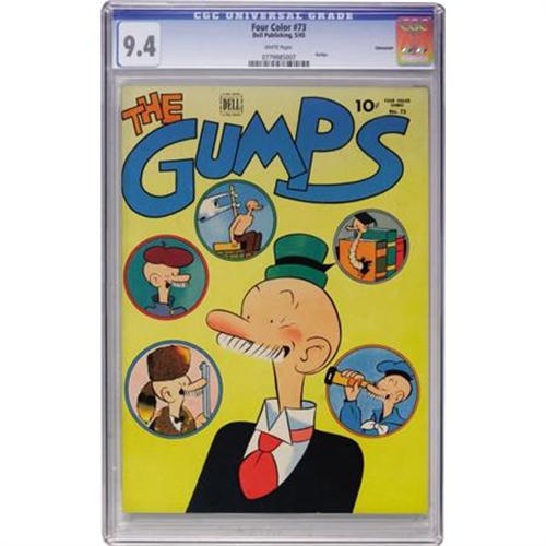 <B>Four Color #73 The Gumps - Vancouver pedigree (Dell, 1945) CGC NM 9.4 White pages.</B></I> This was the only <B>Four Color</B></I> outing for the Gumps, who had already been appearing in comics for almost 30 years by this point! Overstreet 2007 NM- 9.2 value = $200. CGC census 6/07: 1 in 9.4, none higher.<BR><BR><b>Shipping:</b> Comics - Slabbed (certified) (<a target="_blank" href="http://www.heritageauctions.com/common/shipping.php">view shipping information</a>)