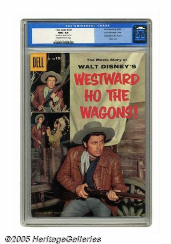 <B>Four Color #738 Circle 8 pedigree - Double Cover (Dell, 1956) CGC NM+ 9.6 Off-white to white pages.</B></I> Photo cover featuring Fess Parker. CGC notes, "1st cover 9.4, interior cover 9.6." Overstreet 2005 NM- 9.2 value = $145. CGC census 4/05: 2 in 9.6, none higher.
