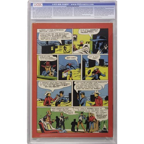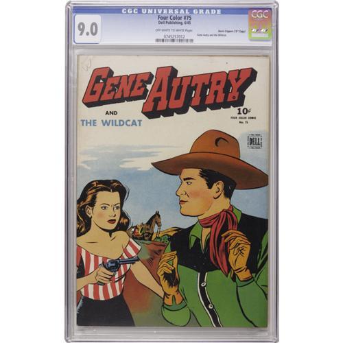 <B>Four Color #75 Gene Autry and the Wildcat - Davis Crippen ("D" Copy) pedigree (Dell, 1945) CGC VF/NM 9.0 Off-white to white pages.</B></I> Those ever-so ambitious collectors who undertake the challenge of a <B>Four Color</B></I> run should be buzzing about this sole highest-graded copy. Overstreet 2006 VF/NM 9.0 value = $379; NM- 9.2 value = $525. CGC census 9/06: 1 in 9.0, none higher. <I>From the Crippen Collection</B></I>.<BR><BR><b>Shipping:</b> Slabbed Comic (<a target="_blank" href="http://www.heritageauctions.com/common/shipping.php">view shipping information</a>)