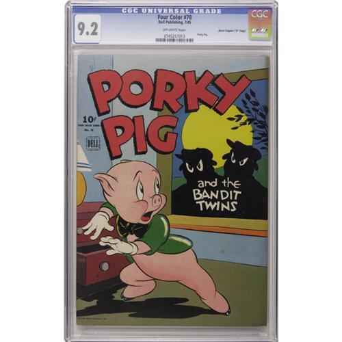 <B>Four Color #78 Porky Pig - Davis Crippen ("D" Copy) pedigree (Dell, 1945) CGC NM- 9.2 Off-white pages.</B></I> "Porky Pig and the Bandit Twins" are featured here. Surprisingly enough, this is one of just two copies CGC has certified to date. Overstreet 2006 NM- 9.2 value = $420. CGC census 9/06: 1 in 9.2, none higher. <I>From the Crippen Collection</B></I>.<BR><BR><b>Shipping:</b> Slabbed Comic (<a target="_blank" href="http://www.heritageauctions.com/common/shipping.php">view shipping information</a>)