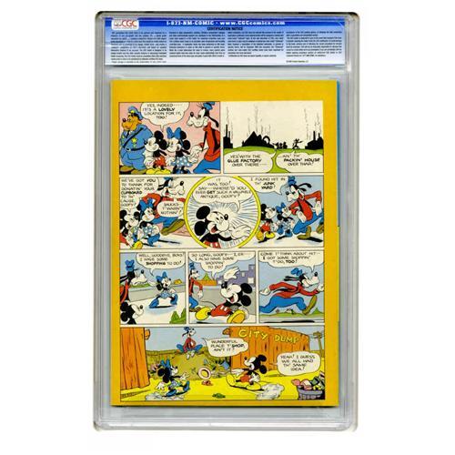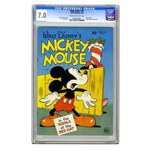 <B>Four Color #79 Mickey Mouse in the Riddle of the Red Hat (Dell, 1945) CGC FN/VF 7.0 Cream to off-white pages.</B></I> It's the only Mickey Mouse story ever drawn by Carl Barks, who was of course the master of all things Duck-related! In "the Riddle of the Red Hat," Mickey makes fun of Minnie's striped hat, she leaves in a huff, and a great mistaken-identity tale ensues. Only two copies of this issue have been certified with higher grades by CGC as of this writing. Overstreet 2005 FN 6.0 value = $300; VF 8.0 value = $757. CGC census 12/05: 1 in 7.0, 2 higher.