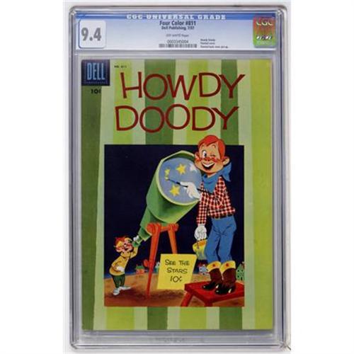 <B>Four Color #811 Howdy Doody (Dell, 1957) CGC NM 9.4 Off-white pages.</B></I> Painted front cover and painted back cover pin-up. Overstreet 2007 NM- 9.2 value = $180. CGC census 9/07: 1 in 9.4, none higher.<BR><BR><b>Shipping:</b> Comics - Slabbed (certified) (<a target="_blank" href="http://www.heritageauctions.com/common/shipping.php">view shipping information</a>)