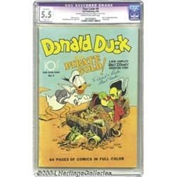 <B>Four Color #9 Donald Duck Finds Pirate Gold (Dell, 1942) CGC Apparent FN- Slight (A) Cream to off-white pages.</B></I> No one did the Donald better than Carl Barks. Barks was the premier writer and artist on this beloved Walt Disney character for over 25 years. Here's his very first comic book work on the feature, a long adventure done in collaboration with writer Bob Karp and fellow artist Jack Hannah (who alternated pages with Barks). This issue kicked off a long-running series of memorable stories for the Dell <B>Four Color</B></I> line of comic book one-shots. Of special note to Barks fans is the fact that he signed the cover of this attractive copy, with the inscription "To David & Linda, Carl Barks." CGC notes, "Restoration includes: small amount of glue on spine of cover." Overstreet 2004 FN 6.0 value = $2,250. <BR><BR><B>Important notice:</B> Heritage usually auctions material at the rate of 200-250 lots per hour. On some occasions eBay Live bid software or the Internet may not be able to keep up with the pace of the auction. We recommend placing a realistic absentee bid now as insurance to avoid disappointment. Occasionally the auctioneer may eliminate or reject an eBay Live bid, and the auctioneer may also reopen a lot after the close of the eBay live bidding (usually because we missed an audience bid), and may reject your bid even if it shows you as the winning bidder. By bidding via eBay Live, you agree that Heritage may award the lot to another bidder at its sole discretion under the circumstances described above or any other reasonable circumstances. Since eBay bids are not shown to us until we open the lot on the floor, we treat those bids just like floor bids. In most cases the floor responds before the eBay bid is presented to us, due to Internet lag time, so for consistency we have made it a policy that floor bids are always considered first over tie eBay live bids. Also please note that all Heritage lots purchased through eBay Live carry a 20% Buyer's Premium. Please make sure you read the Terms and Conditions before you bid. </span></font></tr></table></td></tr></table>