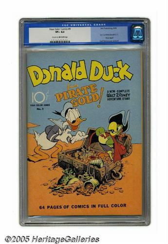 <B>Four Color #9 Donald Duck Finds Pirate Gold (Dell, 1942) CGC VF+ 8.5 Cream to off-white pages.</B></I> The word "genius" is bandied about a lot, but few comic enthusiasts would dispute Carl Barks' inclusion in that category. This milestone issue boasts Barks' very first Donald Duck story, "Donald Duck Finds Pirate Gold." This is by far the most highly prized comic of this series' 1,300-plus issue run! Barks drew the cover as well as the interior art. Huey, Dewey, and Louie also appear. Overstreet 2005 VF 8.0 value = $5,800; VF/NM 9.0 value = $9,813. CGC census 12/04: 2 in 8.5, 3 higher.