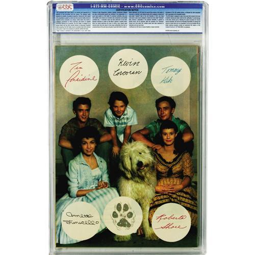 <B>Four Color #985 Shaggy Dog - File Copy (Dell, 1959) CGC NM 9.4 Off-white to white pages.</B></I> If you somehow were deprived of the Disney movie "The Shaggy Dog," we feel sorry for you -- be sure to watch it and bring your kids! Here's the sole highest-graded copy (as of this writing) of the comic book version. There's an ensemble photo back cover featuring a bunch of real <B>Four Color</B></I> veterans like Tommy Kirk (Old Yeller), Tim Considine (Hardy Boys, Spin and Marty... how many <B>Four Color</B></I>s can one kid be in?), and topping that, Annette Funicello, who had two <B>Four Color</B></I>s <I>devoted</B></I> to her! Overstreet 2006 NM- 9.2 value = $115. CGC census 3/06: 1 in 9.4, none higher. <I>From the Random House Archives.</B></I>
