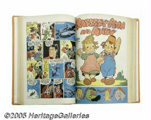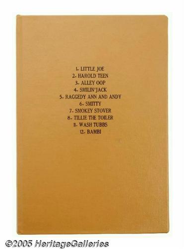 <B>Four Color Bound Volume (Dell, 1942).</B></I> This bound volume contains file copies of <B>Four Color</B></I> (series II) #1-8, 11, and 12, trimmed and bound. All issues have "Western Printing" stamped in ink on the covers, and the cover of #1 has a small piece missing, other than that the condition of these comics is superb. And though #10 and the ultra-valuable #9 weren't included in this bound volume for unknown reasons, the issues that are here offer a typical <B>Four Color</B></I> variety of characters, with Little Joe, Harold Teen, Alley Oop, Smilin' Jack, Raggedy Ann, Smitty, Smokey Stover, Tillie the Toiler, Wash Tubbs, and Bambi on hand. Approximate Overstreet VG value for group = $800. <I>From the Random House Archives</B></I>.
