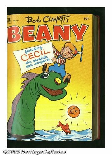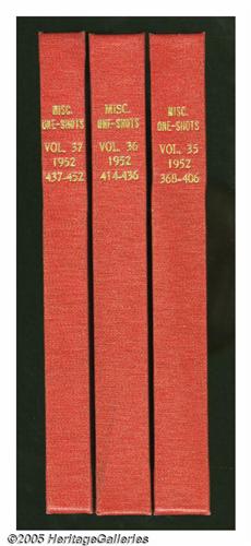 <B>Four Color Bound Volumes (Dell, 1952).</B></I> These are file copies which have been trimmed and bound into three hardcover volumes. Key issues here are #368 (Bob Clampett's Beany and Cecil), 375 (John Carter of Mars), and 381 (Marge's Tubby (#1)). Also included are #377, 380, 389, 391, 396, 398, 402, 404, 406, 414, 415, 417, 418, 423, 424, 425, 428, 430, 434, 435, 436, 437, 438, 440, 441, 443, 444, 447, 448, and 452. Approximate Overstreet VG 4.0 value for group = $700. <I>From the Random House Archives.</B></I>