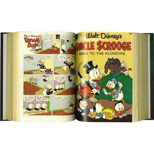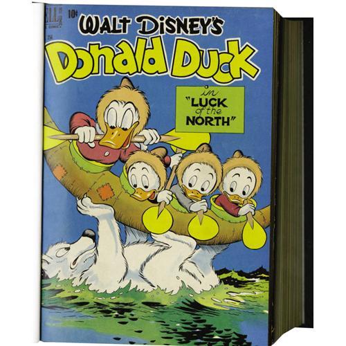 <B>Four Color Cartoon Characters Bound Volume (Dell, 1949-52).</B></I> Although the spine says "Dell Disney," this bound volume actually contains issues of <B>Four Color</B></I> devoted to a number of cartoon characters. Included are copies of #256, 275, 282, 348, 367, 379, 394, 408, and #422 (all featuring Donald Duck, most with stories and/or art by Carl Barks); 456 and #495 (Uncle Scrooge stories and art by Barks); 327 and #347 (Bugs Bunny issues); 304 and #411 (Mickey Mouse stories); 241, 360, and #426 (Porky Pig books); and #305 (Woody Woodpecker); plus #361 (Santa Claus Funnies), trimmed and hardbound with the previous owner's embossed name on the cover. The comics are in nice condition, with appreciable creasing to some of the covers and a mild to moderate amount of page tanning. Overstreet 2006 VG 4.0 value for group = $874.<BR><BR><b>Shipping:</b> Books & Catalogs (<a target="_blank" href="http://www.heritageauctions.com/common/shipping.php">view shipping information</a>)