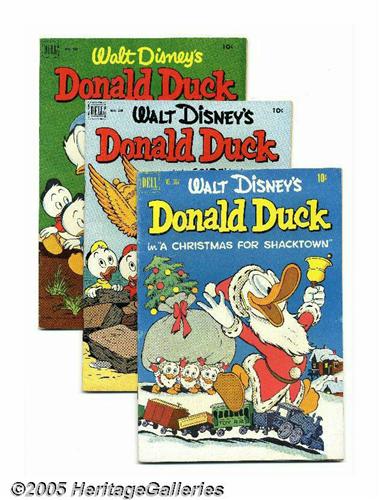 <B>Four Color Donald Duck File Copies Group (Dell, 1951-56) Condition: Average VG+.</B></I> This group includes #353, 367 (Donald Duck in "A Christmas for Shacktown"), 394, 408 ("Donald Duck and the Golden Helmet"; FN/VF condition), 422 ("Donald Duck and the Gilded Man"), 450, 492, 560, 586 (GD condition), 726. All are entitled Walt Disney's Duck Album, except as noted above. Most have Carl Barks covers and/or interior art. Approximate Overstreet value for group = $250. <I>From the Random House Archives</B></I>.
