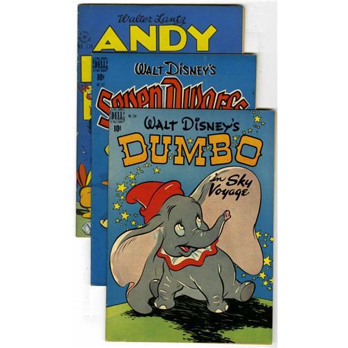 Issues #37 (Bringing Up Father - GD+), #111 (Captain Easy), #130, #154, #198, #280, #297, #326, #345, #409, #507 (all Andy Panda), #180 (Ozark Ike), #193 (Tom and Jerry), #206 (Little Orphan Annie), #227 (Seven Dwarfs), #234 (Dumbo), #257 (Little Iodine), and #272 (Cinderella) are included here. Except for #37, grades range from VG/FN to VF+; the average is FN/VF. Approximate Overstreet value for group = $900. <I>From the Random House Archives.</B></I><BR><BR><b>Shipping:</b> Un-Slabbed Comic (<a target="_blank" href="http://www.heritageauctions.com/common/shipping.php">view shipping information</a>)
