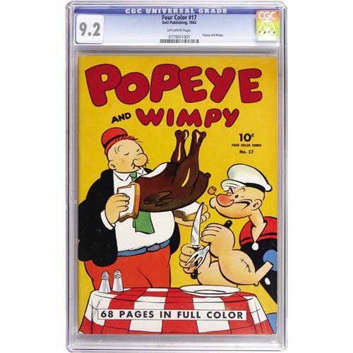 <B>Four Color #17 Popeye and Wimpy (Dell, 1942) CGC NM- 9.2 Off-white pages.</B></I> This stunning, highest graded copy of the issue, starring Popeye and his turkey(?) eating pal Wimpy, has a tight spine and bright cover inks. Overstreet 2006 NM- 9.2 value = $800. CGC census 3/07: 1 in 9.2, none higher.<BR><BR><b>Shipping:</b> Comics - Slabbed (certified) (<a target=""_blank"" href=""http://www.heritageauctions.com/common/shipping.php"">view shipping information</a>)