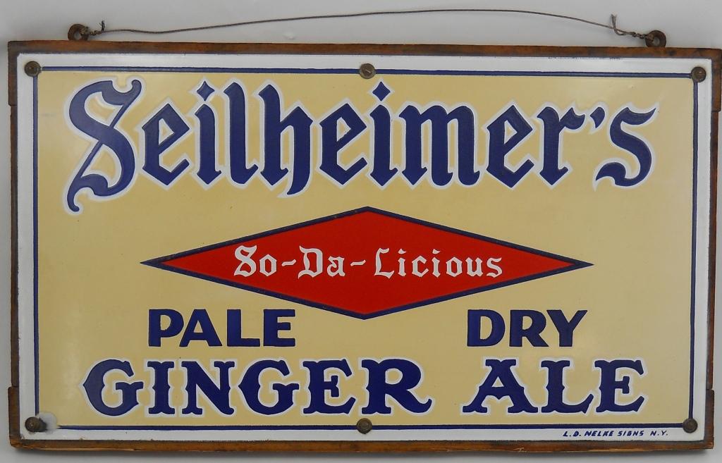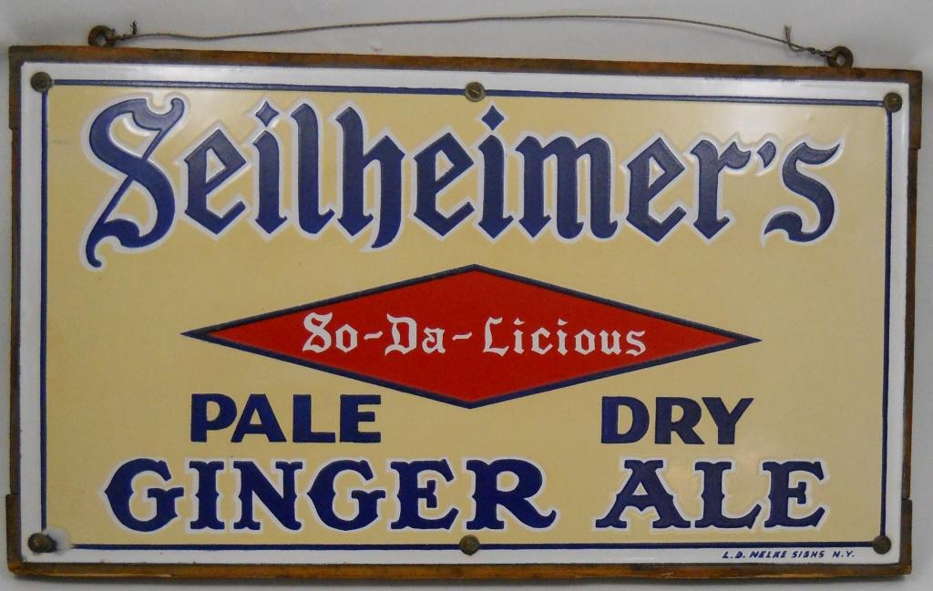 This sign was made by the L.D. Nelke Signs of New York for Seilheimer's Ginger Ale. It has four colors and is mounted on wood (as it was found). It is 18 inches wide x 10 inches tall and in almost perfect condition; a small chip near the bottom-left screw is the only damage.