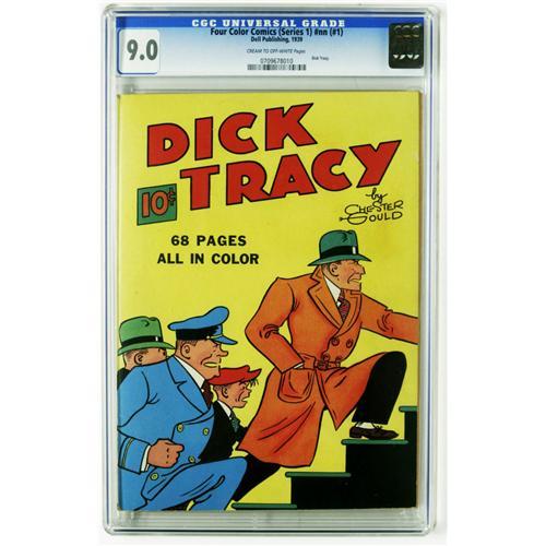 <B>Four Color (Series One) #1 Dick Tracy (Dell, 1939) CGC VF/NM 9.0 Cream to off-white pages.</B></I> The very first issue of Dell's most enduring title featured every comic reader's favorite Dick. This copy is in marvelous condition, especially given its age - over 65 years old! Overstreet 2005 VF/NM 9.0 value = $8,263; NM- 9.2 value = $11,500. CGC census 12/05: 2 in 9.0, 2 higher.