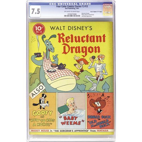<B>Four Color (Series One) #13 Walt Disney's Reluctant Dragon - Davis Crippen ("D" Copy) pedigree (Dell, 1941) CGC VF- 7.5 Off-white to white pages.</B></I> Walt Disney's 1941 "behind the scenes" feature film included an adaptation of Kenneth Grahame's classic dragon tale. This comic book version includes photos from the film, plus a two-page introduction to "Fantasia," and appearances by Mickey Mouse, Donald Duck, Goofy, and Baby Weems. Overstreet 2006 VF 8.0 value = $1,200. CGC census 6/06: 2 in 7.5, 2 higher. <I>From the Crippen Collection.</B></I> <BR><BR><B>Important notice:</B> Heritage usually auctions material at the rate of 200-250 lots per hour. On some occasions eBay Live bid software or the Internet may not be able to keep up with the pace of the auction. We recommend placing a realistic absentee bid now as insurance to avoid disappointment. Occasionally the auctioneer may eliminate or reject an eBay Live bid, and the auctioneer may also reopen a lot after the close of the eBay live bidding (usually because we missed an audience bid), and may reject your bid even if it shows you as the winning bidder. By bidding via eBay Live, you agree that Heritage may award the lot to another bidder at its sole discretion under the circumstances described above or any other reasonable circumstances. Since eBay bids are not shown to us until we open the lot on the floor, we treat those bids just like floor bids. In most cases the floor responds before the eBay bid is presented to us, due to Internet lag time, so for consistency we have made it a policy that floor bids are always considered first over tie eBay live bids. Also please note that all Heritage lots purchased through eBay Live carry a 22.5% Buyer's Premium. Please make sure you read the Terms and Conditions before you bid. This lot is being auctioned in conjunction with a live floor auction by Heritage Auction Galleries. All final auction and invoice information will be supplied by Heritage Auction Galleries, and all other information should be considered preliminary. Lot:41001 <BR><BR><B>Winning Notification and Billing:</B> After the FINAL session in this auction is complete, Heritage will send e-mail and snail mail invoices. This process normally takes several days. All final auction and invoice information will be supplied by Heritage Auction Galleries, and all other information should be considered preliminary. <BR><BR>This auction will be conducted on a live auction floor and over the Internet through eBay Live. If you choose to place an absentee bid, please take a moment to <font color='#0000ff'><u><a href='http://pages.ebay.com/liveauctions/help/before/laabsentee.html'>learn how eBay Live absentee bidding works</a></u></font><font color='#000000'>