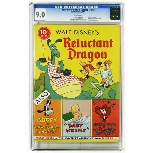 <B>Four Color (Series One) #13 Walt Disney's Reluctant Dragon (Dell, 1941) CGC VF/NM 9.0 White pages.</B></I> Walt Disney's 1941 "behind the scenes" feature film included an adaptation of Kenneth Grahame's classic dragon tale. This comic book version includes photos from the film, plus a two-page introduction to "Fantasia," and appearances by Mickey Mouse, Donald Duck, Goofy, and Baby Weems. Overstreet 2005 VF/NM 9.0 value = $1,820; NM- 9.2 value = $2,500. CGC census 12/05: 1 in 9.0, 1 higher.
