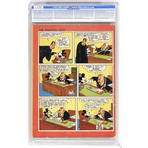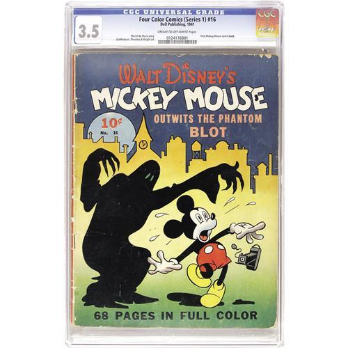 <B>Four Color (Series One) #16 Mickey Mouse (Dell, 1941) CGC VG- 3.5 Cream to off-white pages.</B></I> This is the first Mickey Mouse comic book, so how can you pass it up? Especially since it's got Floyd Gottfredson's "Phantom Blot" storyline, which premiered in the funny papers. High-grade copies are very difficult to find, and even this VG- book should be popular with bidders. Overstreet 2006 VG 4.0 value = $2,840. CGC census 6/06:4 in 3.5, 14 higher. <BR><BR><B>Important notice:</B> Heritage usually auctions material at the rate of 200-250 lots per hour. On some occasions eBay Live bid software or the Internet may not be able to keep up with the pace of the auction. We recommend placing a realistic absentee bid now as insurance to avoid disappointment. Occasionally the auctioneer may eliminate or reject an eBay Live bid, and the auctioneer may also reopen a lot after the close of the eBay live bidding (usually because we missed an audience bid), and may reject your bid even if it shows you as the winning bidder. By bidding via eBay Live, you agree that Heritage may award the lot to another bidder at its sole discretion under the circumstances described above or any other reasonable circumstances. Since eBay bids are not shown to us until we open the lot on the floor, we treat those bids just like floor bids. In most cases the floor responds before the eBay bid is presented to us, due to Internet lag time, so for consistency we have made it a policy that floor bids are always considered first over tie eBay live bids. Also please note that all Heritage lots purchased through eBay Live carry a 22.5% Buyer's Premium. Please make sure you read the Terms and Conditions before you bid. This lot is being auctioned in conjunction with a live floor auction by Heritage Auction Galleries. All final auction and invoice information will be supplied by Heritage Auction Galleries, and all other information should be considered preliminary. Lot:41001 <BR><BR><B>Winning Notification and Billing:</B> After the FINAL session in this auction is complete, Heritage will send e-mail and snail mail invoices. This process normally takes several days. All final auction and invoice information will be supplied by Heritage Auction Galleries, and all other information should be considered preliminary. <BR><BR>This auction will be conducted on a live auction floor and over the Internet through eBay Live. If you choose to place an absentee bid, please take a moment to <font color='#0000ff'><u><a href='http://pages.ebay.com/liveauctions/help/before/laabsentee.html'>learn how eBay Live absentee bidding works</a></u></font><font color='#000000'>