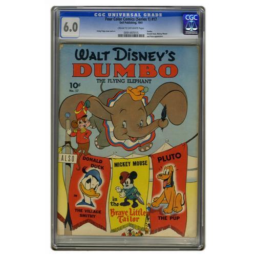 <B>Four Color (Series One) #17 Dumbo (Dell, 1941) CGC FN 6.0 Cream to off-white pages.</B></I> This is the first comic book devoted to Dumbo, and joining the fun are Disney stars Mickey Mouse, Donald Duck, and Pluto. Irving Tripp supplied both cover and interior art. Overstreet 2006 FN 6.0 value = $636. CGC census 1/06: 2 in 6.0, 3 higher.