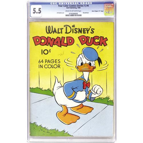 <B>Four Color (Series One) #4 Donald Duck - Davis Crippen ("D" Copy) pedigree (Dell, 1940) CGC FN- 5.5 Cream to off-white pages.</B></I> This specimen is just a half-grade below the finest known copy of the issue! This early Donald Duck appearance, drawn by Al Taliaferro, is on Overstreet's list of the 100 most valuable Golden Age comics. Overstreet notes, "prices vary widely on this book," and in our experience the variation has all been in one direction, namely upward. Overstreet 2006 FN 6.0 value = $3,000. CGC census 6/06: 2 in 5.5, 1 higher. <I>From the Crippen Collection.</B></I> <BR><BR><B>Important notice:</B> Heritage usually auctions material at the rate of 200-250 lots per hour. On some occasions eBay Live bid software or the Internet may not be able to keep up with the pace of the auction. We recommend placing a realistic absentee bid now as insurance to avoid disappointment. Occasionally the auctioneer may eliminate or reject an eBay Live bid, and the auctioneer may also reopen a lot after the close of the eBay live bidding (usually because we missed an audience bid), and may reject your bid even if it shows you as the winning bidder. By bidding via eBay Live, you agree that Heritage may award the lot to another bidder at its sole discretion under the circumstances described above or any other reasonable circumstances. Since eBay bids are not shown to us until we open the lot on the floor, we treat those bids just like floor bids. In most cases the floor responds before the eBay bid is presented to us, due to Internet lag time, so for consistency we have made it a policy that floor bids are always considered first over tie eBay live bids. Also please note that all Heritage lots purchased through eBay Live carry a 22.5% Buyer's Premium. Please make sure you read the Terms and Conditions before you bid. This lot is being auctioned in conjunction with a live floor auction by Heritage Auction Galleries. All final auction and invoice information will be supplied by Heritage Auction Galleries, and all other information should be considered preliminary. Lot:41001 <BR><BR><B>Winning Notification and Billing:</B> After the FINAL session in this auction is complete, Heritage will send e-mail and snail mail invoices. This process normally takes several days. All final auction and invoice information will be supplied by Heritage Auction Galleries, and all other information should be considered preliminary. <BR><BR>This auction will be conducted on a live auction floor and over the Internet through eBay Live. If you choose to place an absentee bid, please take a moment to <font color='#0000ff'><u><a href='http://pages.ebay.com/liveauctions/help/before/laabsentee.html'>learn how eBay Live absentee bidding works</a></u></font><font color='#000000'>