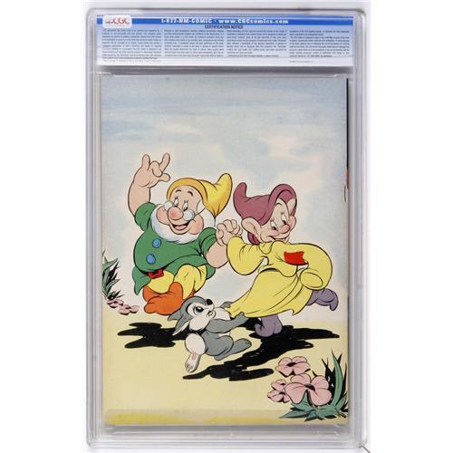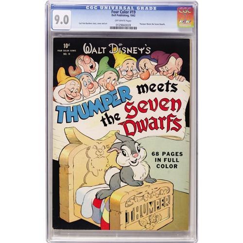 <B>Four Color #19 Thumper Meets the Seven Dwarfs (Dell, 1943) CGC VF/NM 9.0 Off-white pages.</B></I> Bambi's friend meets Snow White's pals, how's that for a big crossover event! Carl Von Buettner wrote the story and drew the entire issue. Only one copy has been graded higher as of this writing. Overstreet 2006 VF/NM 9.0 value = $639; NM- 9.2 value = $885. CGC census 3/07: 1 in 9.0, 1 higher.<BR><BR><b>Shipping:</b> Comics - Slabbed (certified) (<a target=""_blank"" href=""http://www.heritageauctions.com/common/shipping.php"">view shipping information</a>)