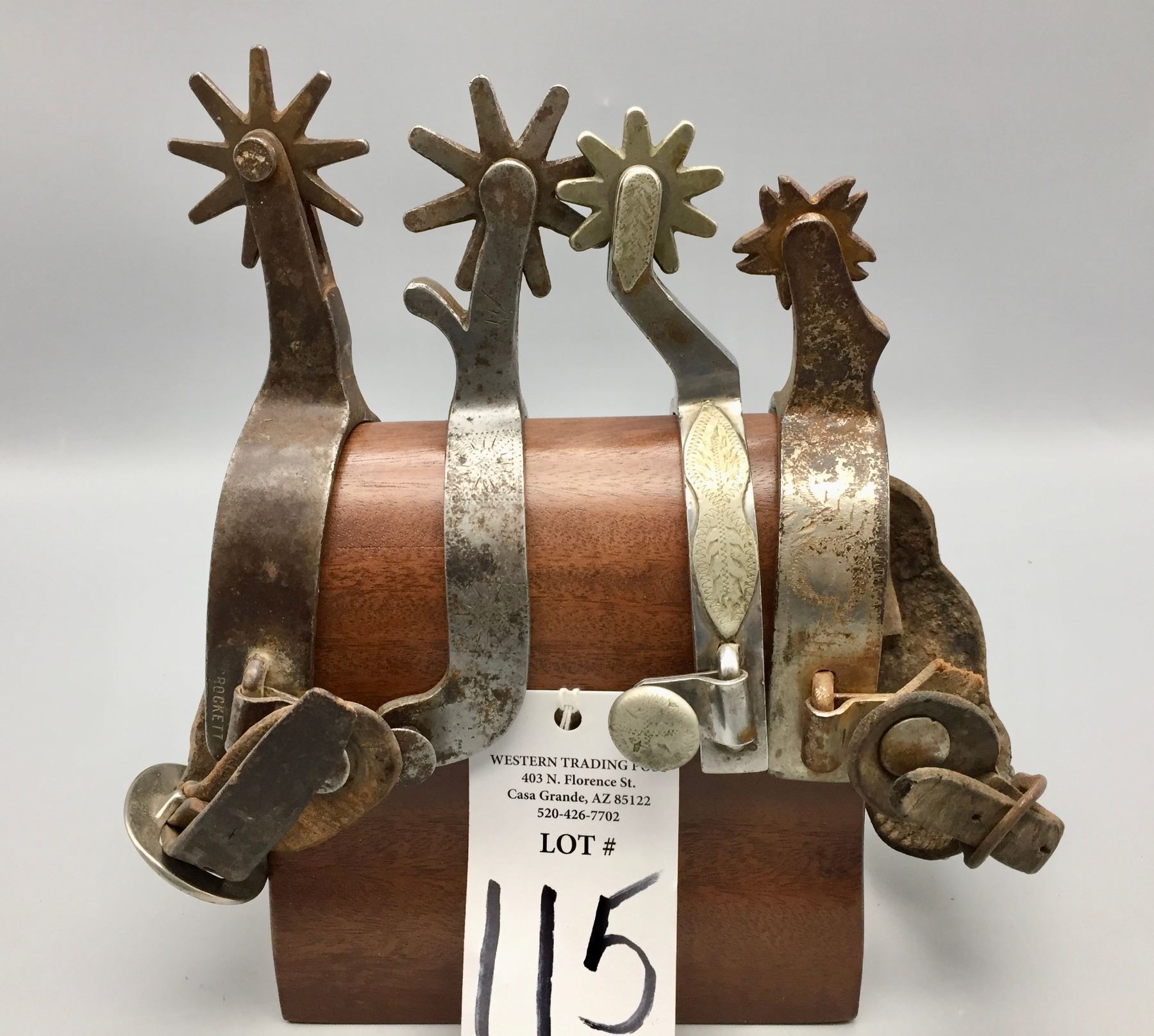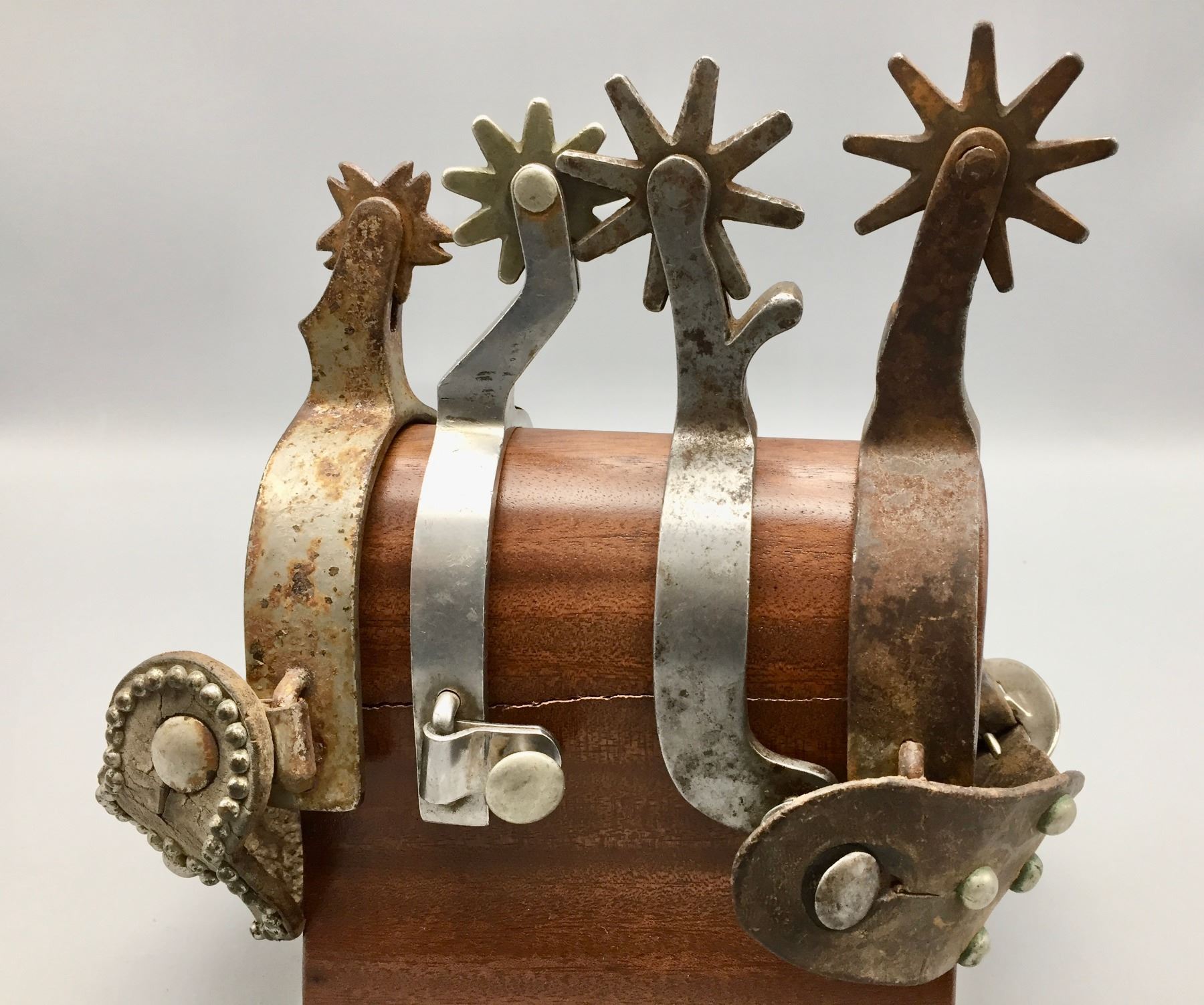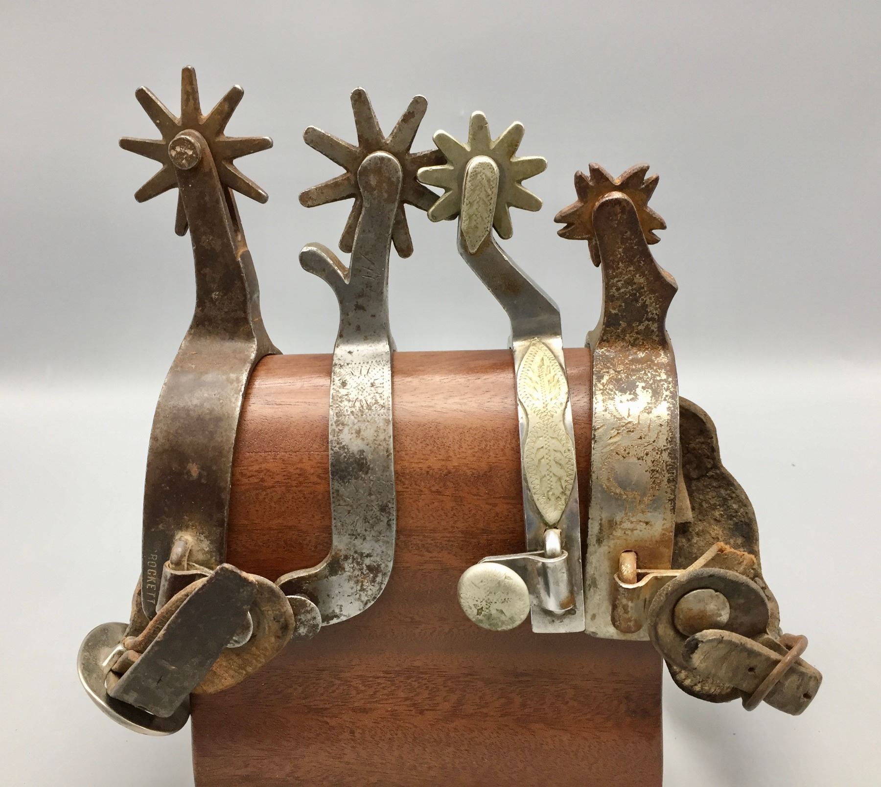Description: Included for sale in this lot are four, single Crockett spurs in varying styles and designs. Maker: Various.
