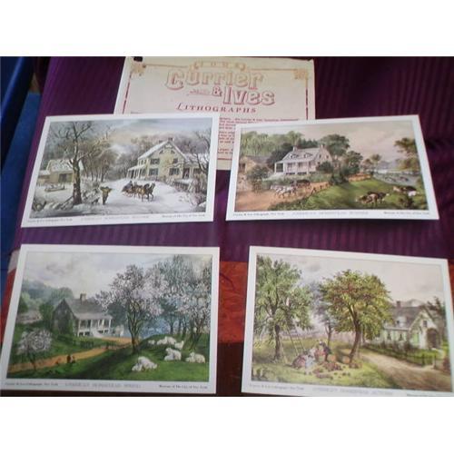 Currier & Ives American Homestead Lithograph prints. There is one each Spring, Summer, Winter, and Autumn. Each print is 5x7 and is in mint condition. They are in the original envelope that they came in with An explanation of the prints. These were probably given away as a premium of some sort in the 40s and 50s. The prints are high quality and suitable for framing.