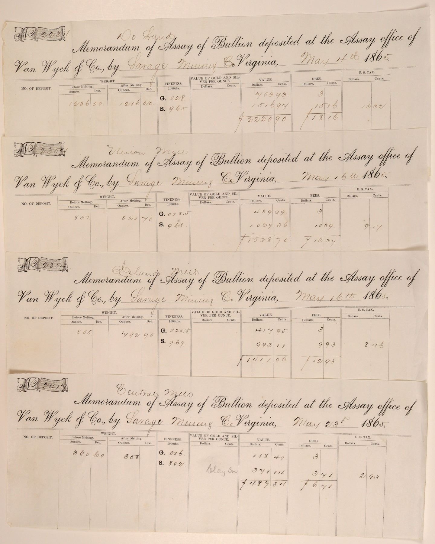 All assayed by Van Wyck in May of 1865. The mills were the Central, Island, Union and DeLand. (Rarer mill located half way down Six Mile Canyon. 15 stamps. Named for owner. Idle by 1871.) Notice when these bars reached Van Wyck they ranged from 360 to 1200 ounces. The Savage Mining Company probably sent splits of bullion from the same location in the mine to different custom mills to see who was 'honest' and who was not. Here, the Central is singled out with a very low gold(.016) and silver (.802) amount. A more normal range would have been gold (.025 to .028) and silver (.965 to .969). At this point the mine manager would cut off shipments to the Central Mill. In another lot in this sale note the Central's silver and gold assays are also low. City: Virginia City State: Nevada Date: 1865